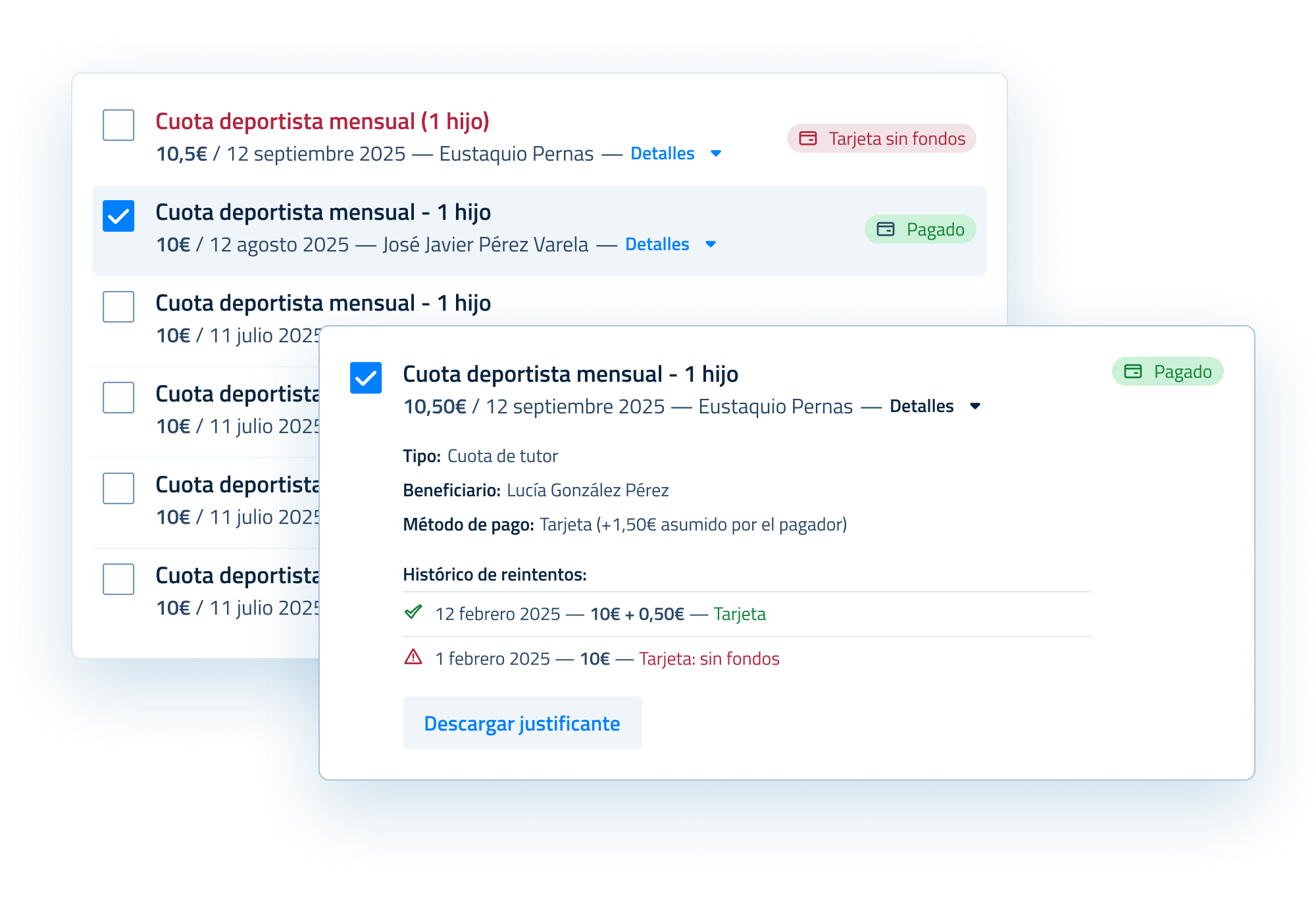- Simplifica todos los cobros a socios/padres/aficionados: entradas, material deportivo, viajes a torneos...