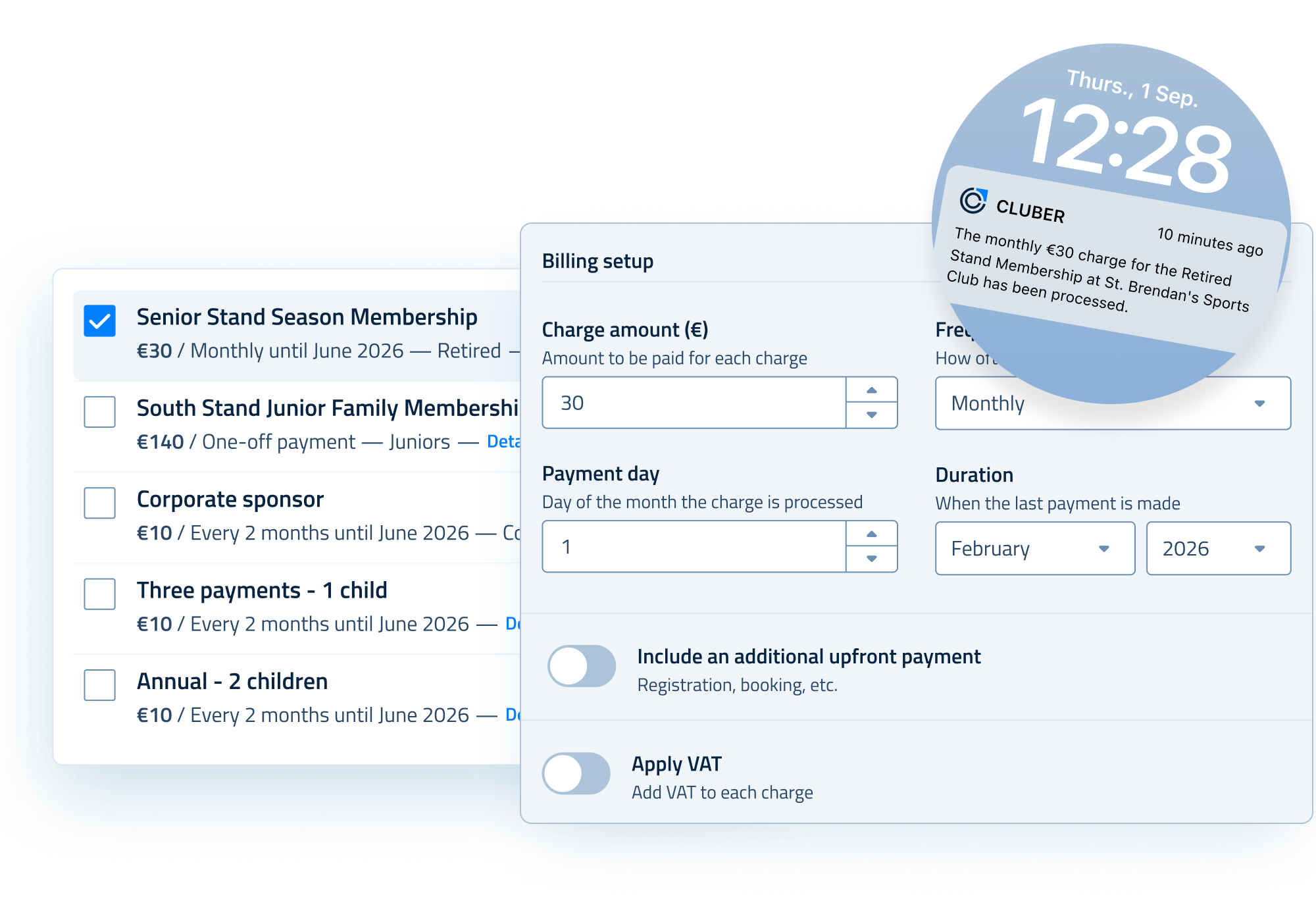 Create membership fees once and let the system take care of the rest automatically, month after month.